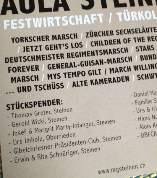 Der Gibelchriesner Präsidenten-Club unterstützt die Musikgesellschaft Steinen bei ihrem Marschmusikkonzert vom 24. November 2012 mit einer Stückspende. Als Beitrag zu dem besonderen Projekt der MG Steinen, an diesem Konzert nur Marschmusik zu spielen, spendeten wir ihnen den bekannten General-Guisan-Marsch.